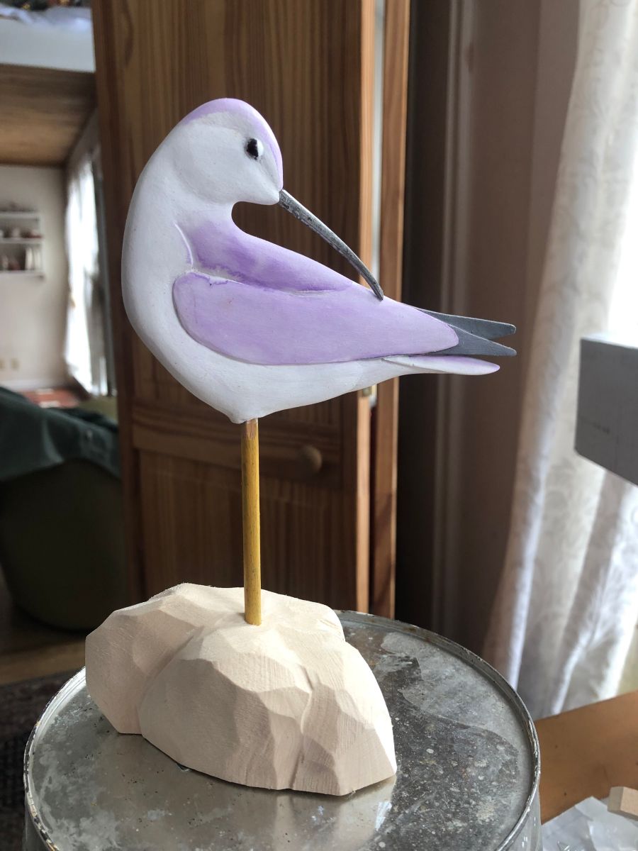 This class will take place over two consecutive afternoons. The first session will be carving and sanding a Basswood bird cutout. The second session will be devoted to painting the bird carving and its wooden base with acrylic paint. The bird blank is relatively thin so although it will take less time than carving a fully round bird this project presents as many carving challenges.