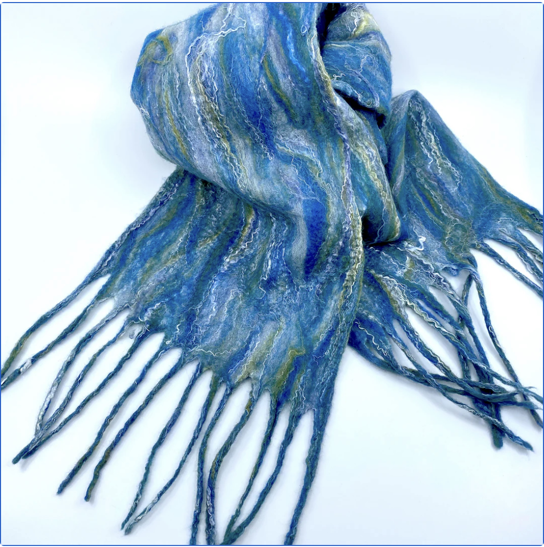 Learn the basics of nuno felting to create a lightweight, textured scarf. Perfect for beginners and experienced felters. Some upper body strength required. Wear comfortable shoes.