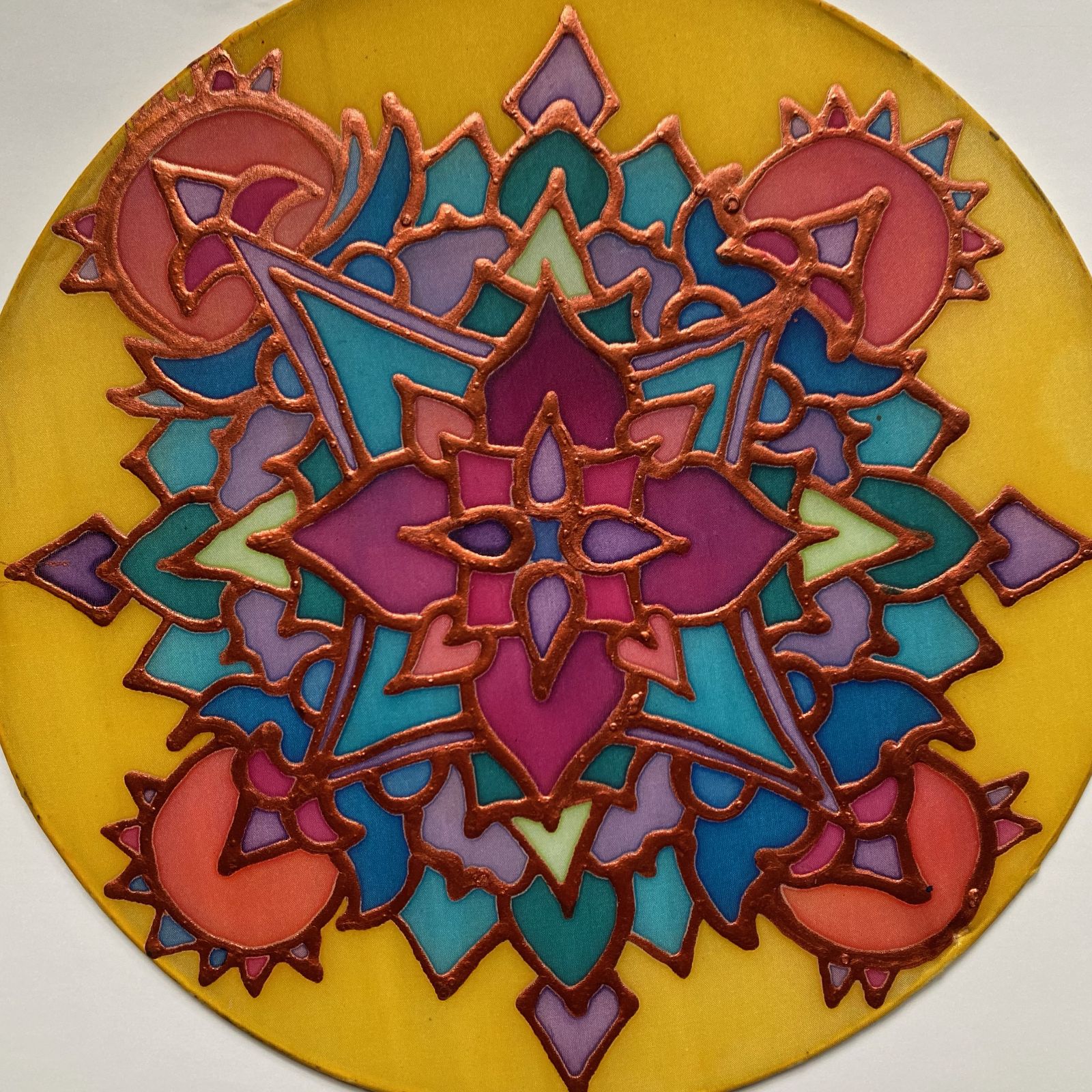 Exploring silk painting techniques, as well as symbols & shapes which we imbue with our personal meanings, we will create mandalas on stretched silk hoops using dye resist and silk paint.